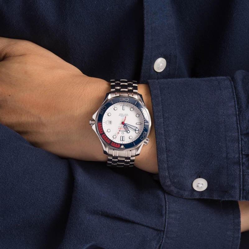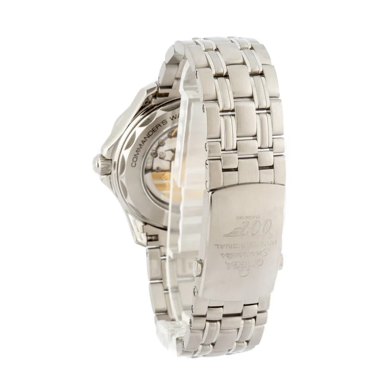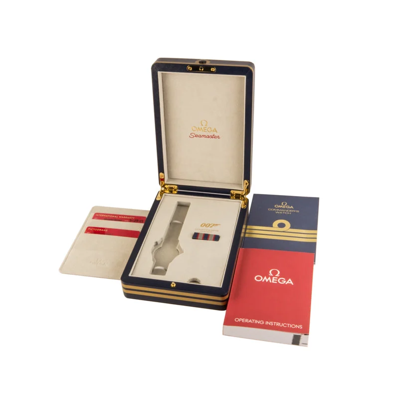 Pre-owned Omega Seamaster ref 212.32.41.20.04.001 (2017) limited edition James Bond watch was released in 2017 in quantities of just 7,007. While other Bond Omegas follow a similar design blueprint, this model stands apart with its striking white ceramic dial and blue and red design elements. The dial is decorated with blued skeleton hands and a vibrant red seconds hand with a 007 counterweight. Additionally, the dial features blued hour markers and a date wheel with a red "7." Flipping the watch over, we see the Omega caliber 2507 mechanical movement adorned with special 007 decorations. This Omega is no longer in production. Don't miss out on the opportunity to add it to your collection in excellent secondhand condition.