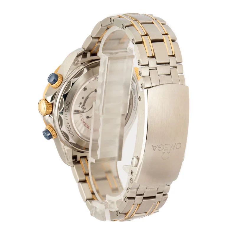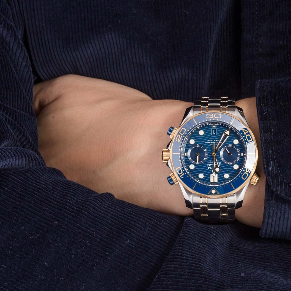 Pre-owned Omega Seamaster Pro 300M ref 210.20.44.51.03.001 in steel and yellow gold is a stunning edition of the famous dive watch. The two-tone finish is paired with a lustrous polished blue ceramic bezel insert decorated with a luxurious Ceragold™ diving scale, matching blue ceramic pushers, and a matching blue dial adorned with crisp, laser-engraved waves, the date at 6 o'clock, and 18k yellow gold hour markers and hands filled with Super-LumiNova. The case offers water resistance up to 300 meters - perfect for any multi-faceted lifestyle. Ref. 210.20.44.51.03.001 also features the celebrated Master Chronometer caliber 9900 self-winding movement with substantial anti-magnetism and a 60-hour power reserve.