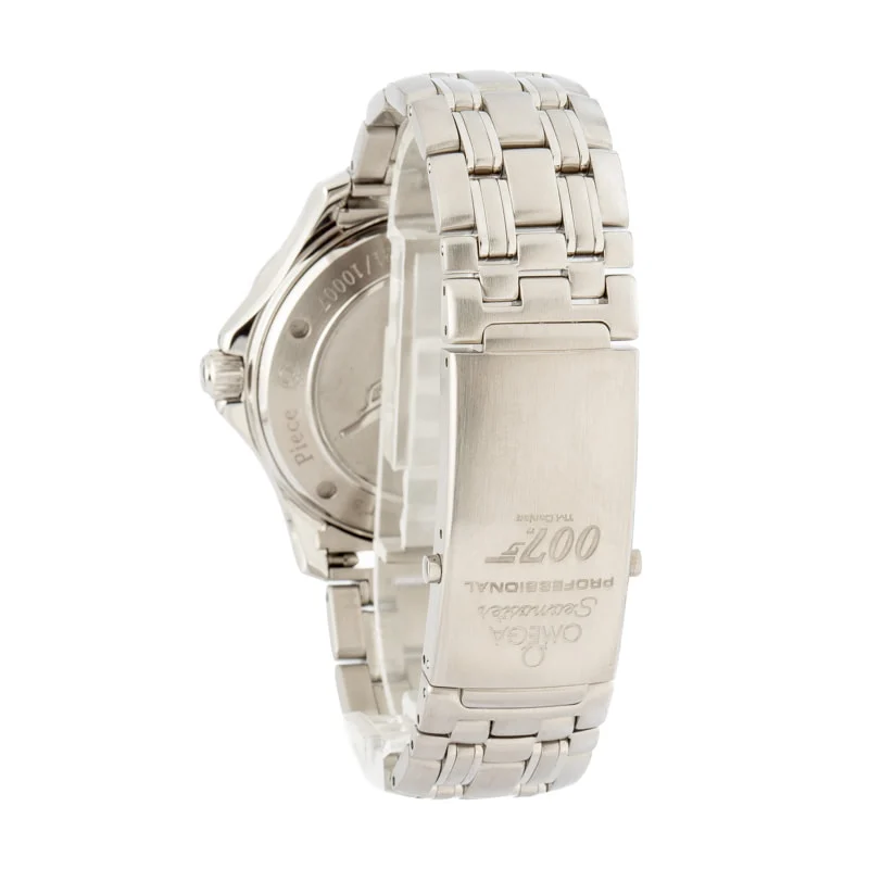 Pre-owned Omega Seamaster Diver 300M ref 212.30.41.20.01.001 (2008) joined the brand's ever-growing arsenal of James Bond-inspired watches in 2008. The Quantum of Solace Omega references the film in a few ways, including a special 007 case back medallion surrounded by the distinction "James Bond Collector's Piece" and a 007 counterweight on the seconds hand. When it comes to James Bond watches, this one has a very approachable design set. It maintains its identity as a classic Seamaster Diver 300M yet has subtle references to the Bond franchise. This limited edition model was produced in quantities of just 10,007 watches and featured a striking black dial and bezel and a stainless steel finish. We can easily see this watch tucked under the sleeve of a black tux like Bond or paired with casual weekend attire.