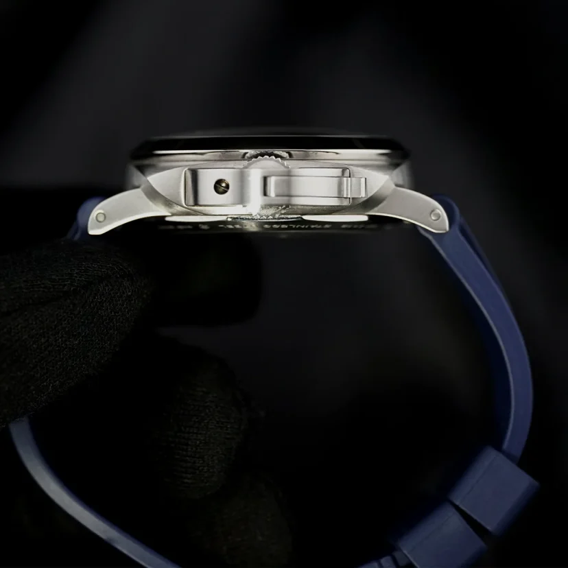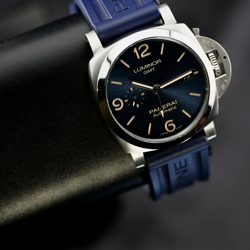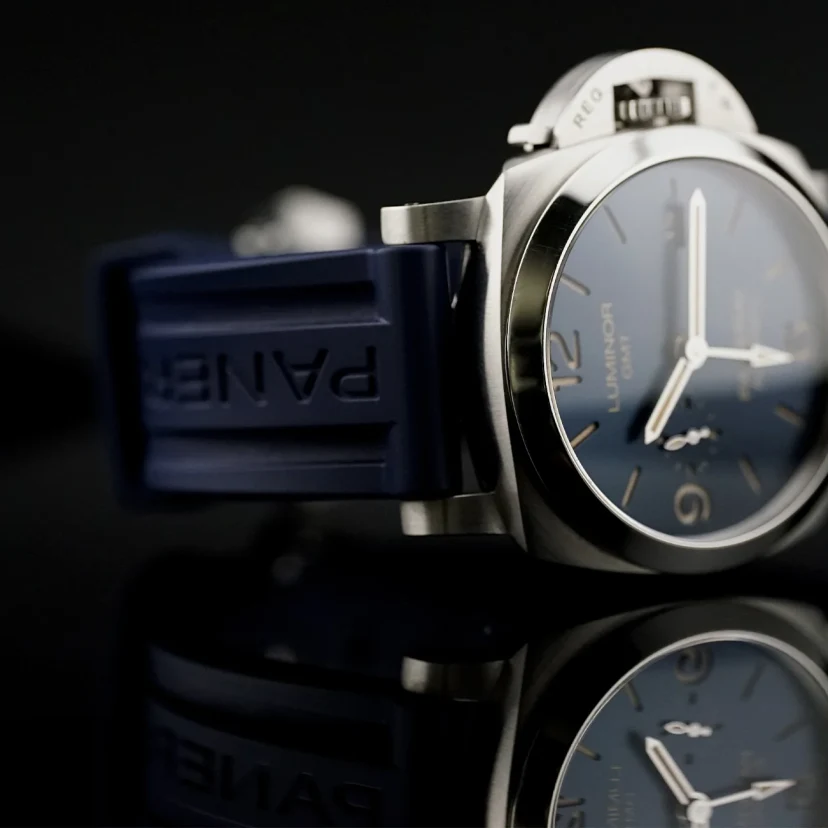 This is the PAM01033 of Panerai, with a 44mm Stainless steel case fitted on a blue alligator strap. Blue sun-brushed dial with luminous Arabic numerals and hour markers. Date at 3 o'clock, small seconds at 9 o'clock, also with power reserve Indicator on the back, GMT and seconds reset