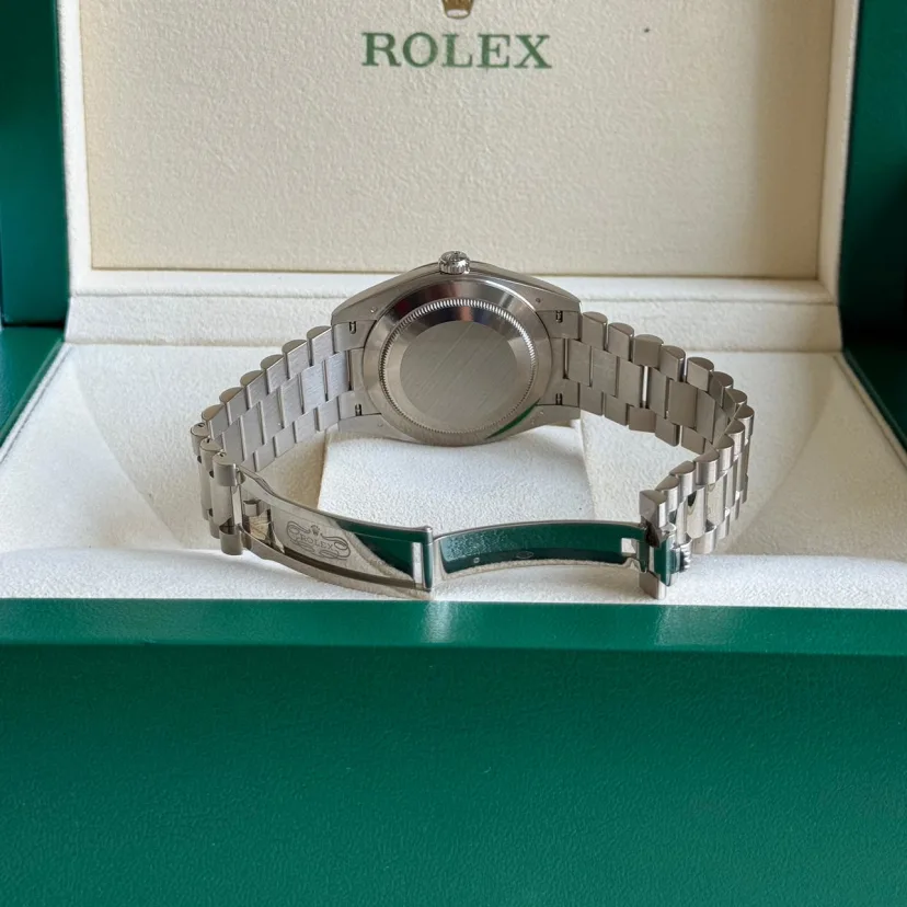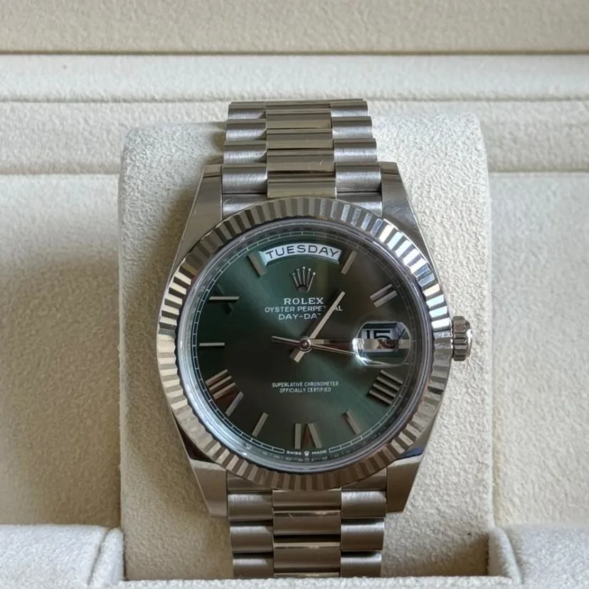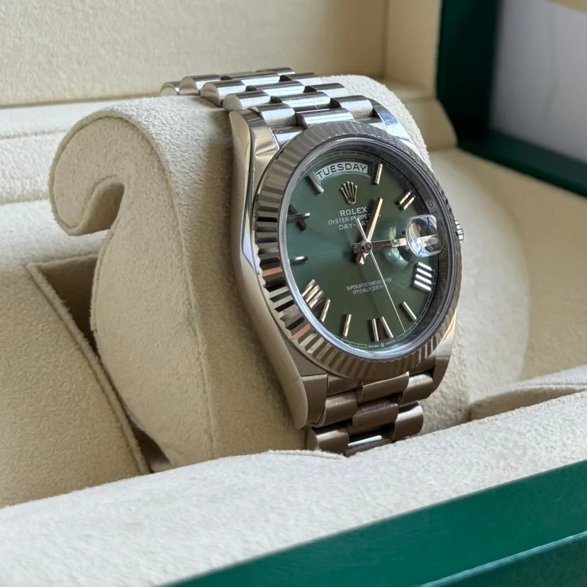 • 2023 Rolex Day-Date 40 White Gold / Fluted / Olive-Green / Roman