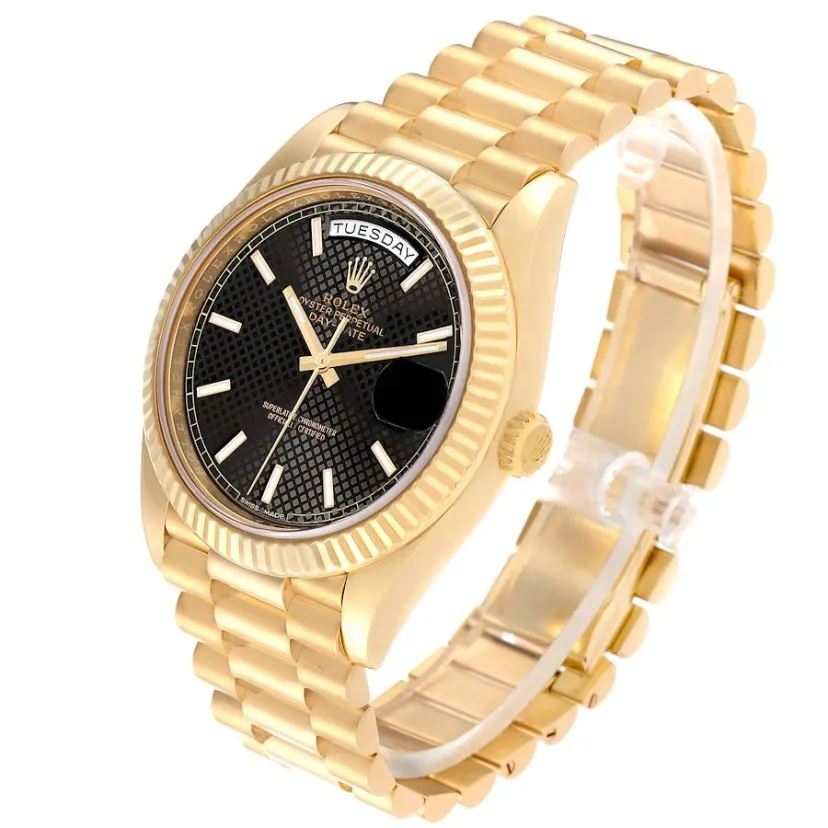 Introduced at Baselworld 2015, the Day-Date 40 ushers in a new era in the history of this Rolex icon. Its case is noticeably bigger than the classic Day Date, though is slightly smaller than the Day-Date II. It is powered by the highly innovative caliber 3255 movement. The present example features a yellow gold case with a matching bracelet and black dial.