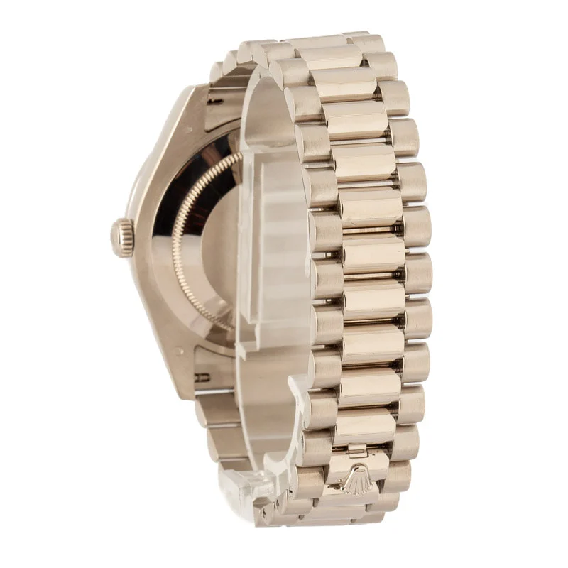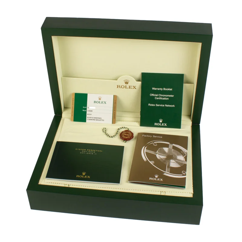 Pre-owned Rolex Day-Date II ref 218349 (2015) is the iconic gold Rolex many desire, but sparkling in diamond embellishments. The bezel is a handset with high-quality, brilliant-cut diamonds, which mirror the gorgeous silver dial adorned with baguette and brilliant-cut diamond hour markers. The result is a Rolex that shimmers from every angle and adds immense value to any watch box. The beloved Rolex Presidential is always dressed in precious metal. This model opts for lustrous 18k white gold forged in the Rolex foundry and finished to perfection to offer a lifetime of shine and wrist presence. Outwardly, this authentic Rolex is impressive. However, it also boasts a COSC-rated self-winding mechanical movement and Oyster case rated waterproof up to 100 meters/330 feet.