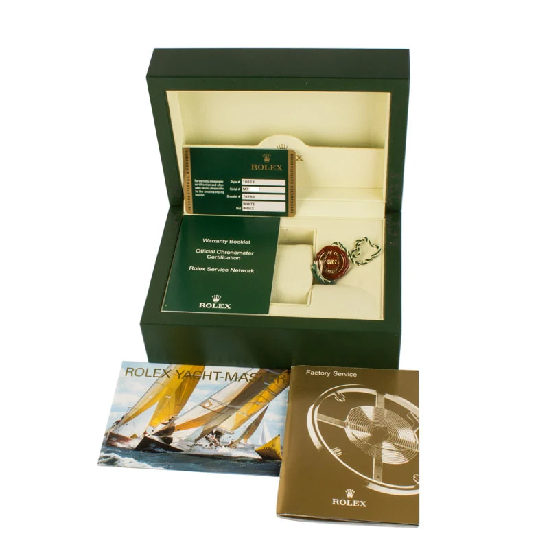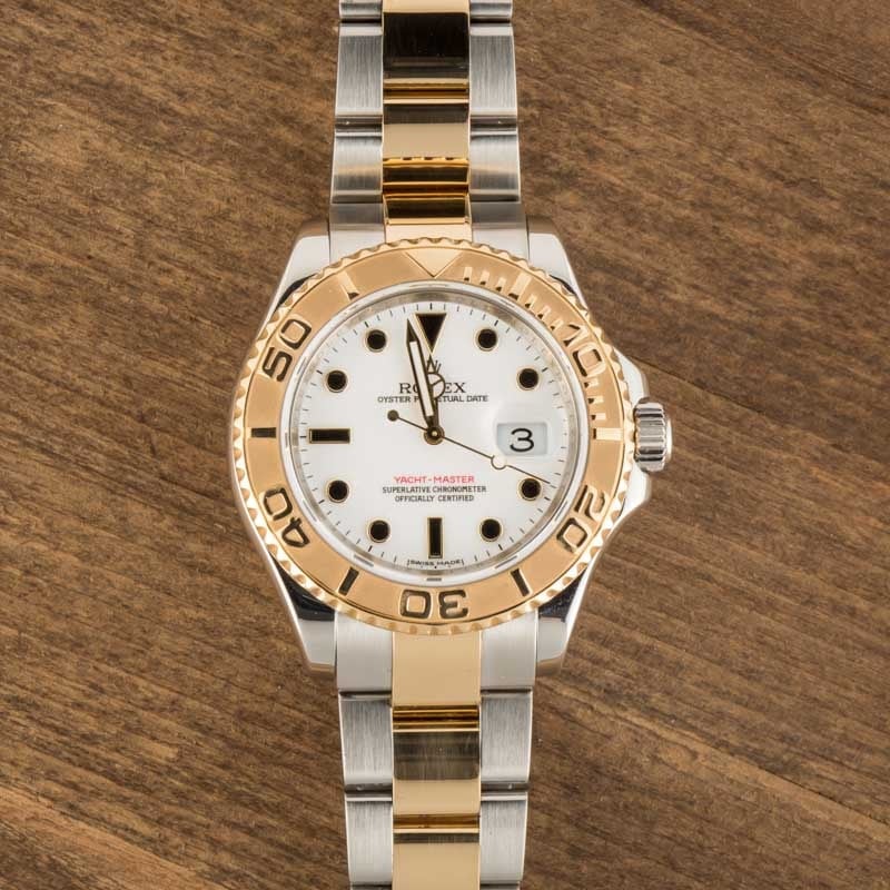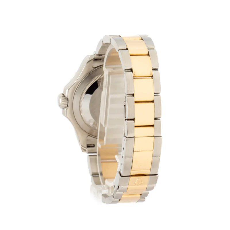 This Rolex Yacht-Master ref. 16623 (2008) features a 40mm stainless steel case with a yellow gold timing bezel and a white dial with black hour markers. It comes with a two-tone Oyster bracelet and is powered by the 3135 movement, offering a luxurious yet sporty aesthetic.