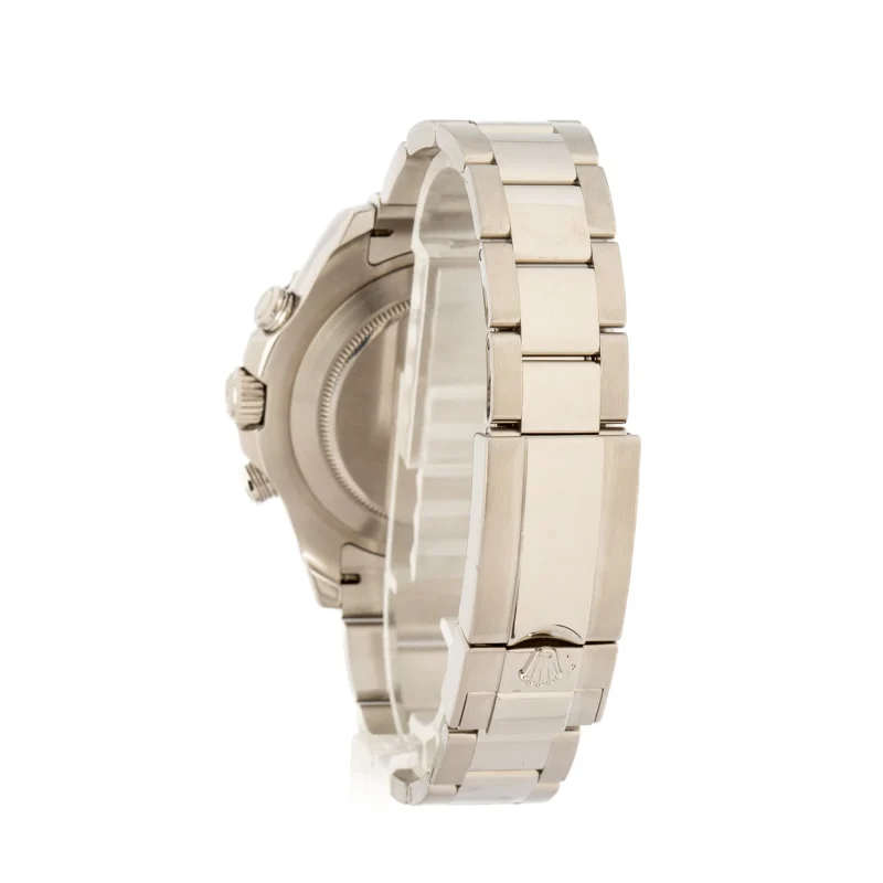 This Rolex Yacht-Master II ref. 116680 (2013) features a 44mm stainless steel case with a blue ceramic bezel and a white Chromalight dial. It comes with an Oyster bracelet and is powered by the 4161 movement, offering precise regatta timing in a robust and sporty design.